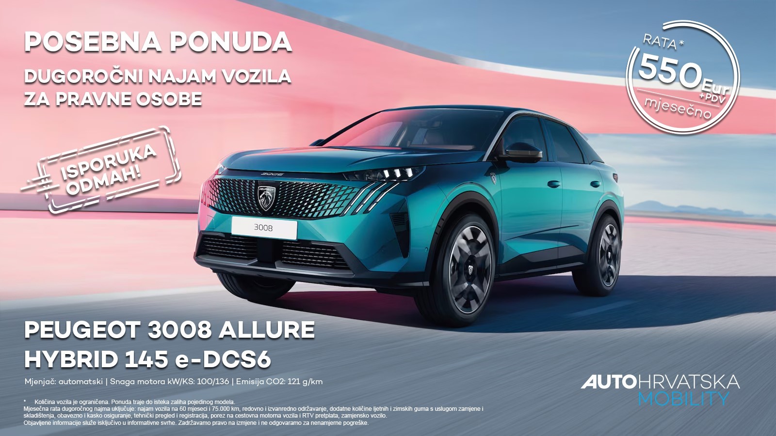 ▶️Peugeot 3008 Allure Hybrid dostupan je za dugoročni najam vozila po mjesečnoj rati od 550 €+pdv.